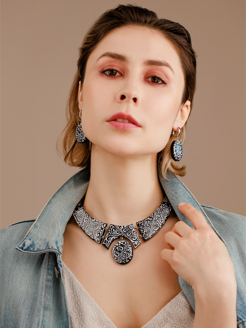 Бижутерия Raisa Plettserr - это всегда результат вдохновения и кропотливой ручной работы. Относительно своих размеров колье легкое, хотя смотрятся очень массивно, секрет в том, что основа деревянная. Поверх рисунка заливаем ювелирной смолой, покрываем защитным лаком.