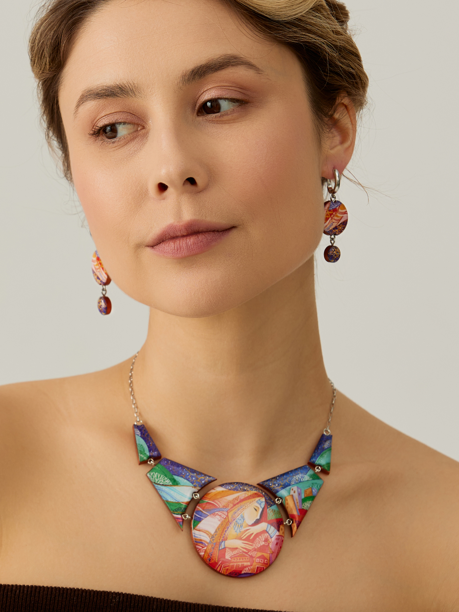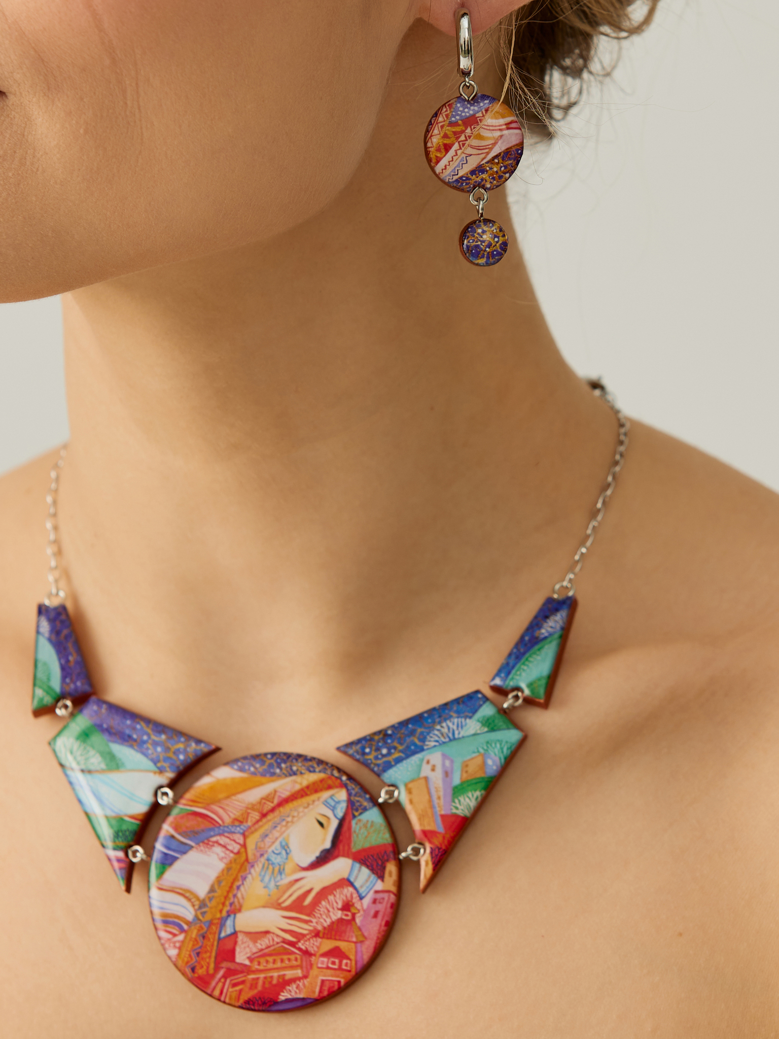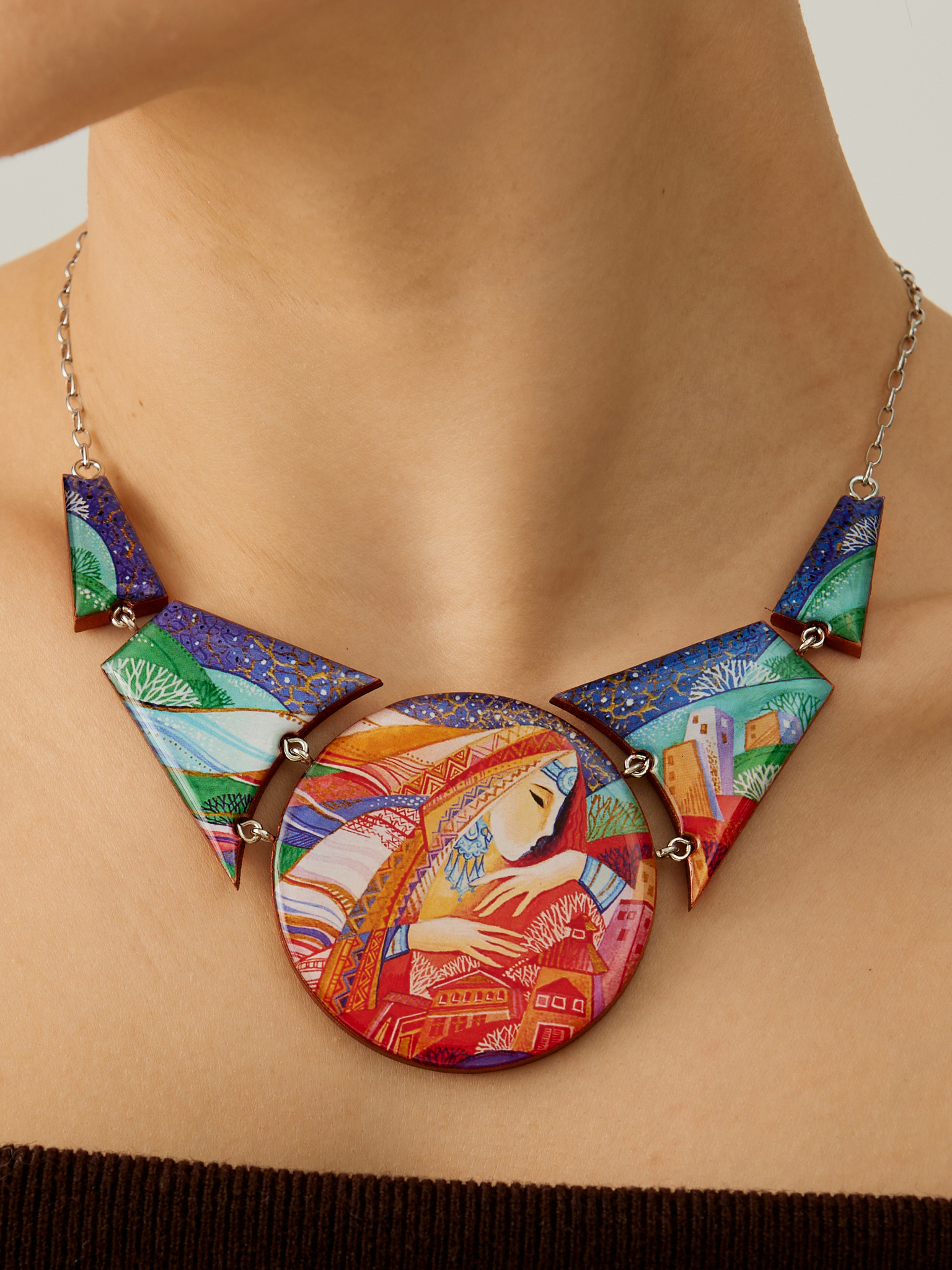 Бижутерия Raisa Plettserr - это всегда результат вдохновения и кропотливой ручной работы. Относительно своих размеров колье легкое, хотя смотрятся очень массивно, секрет в том, что основа деревянная. Задние и боковые поверхности бронзового цвета. Поверх рисунка заливаем ювелирной смолой, покрываем защитным лаком.
