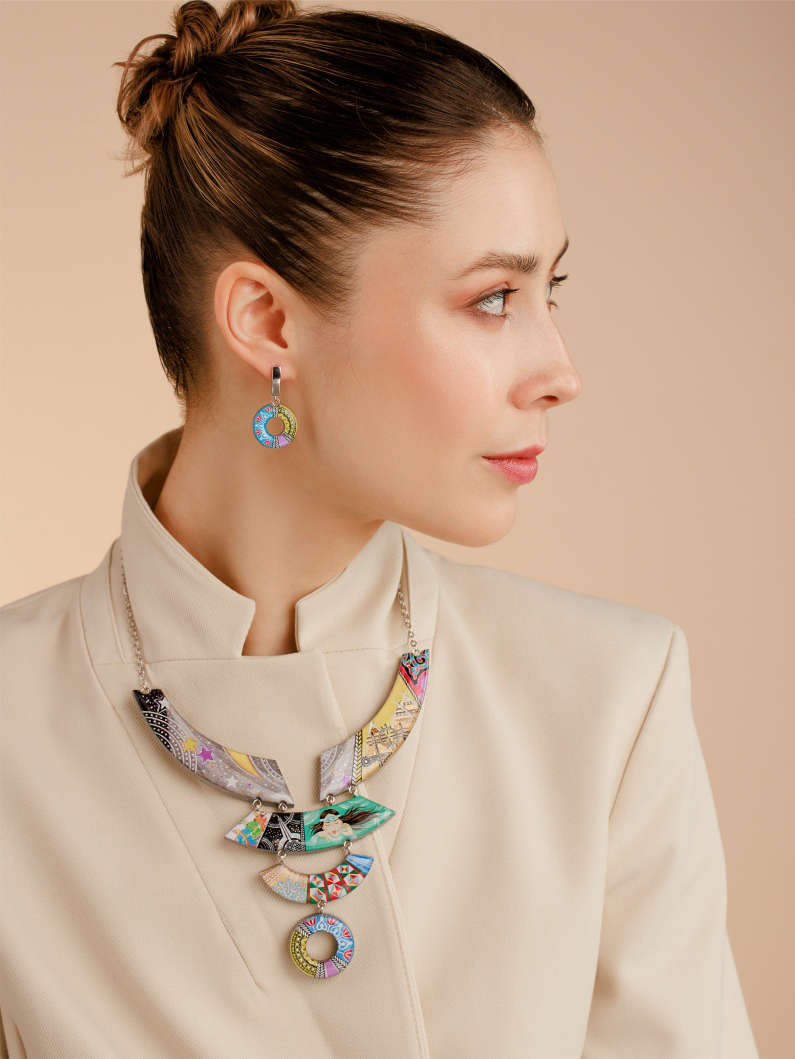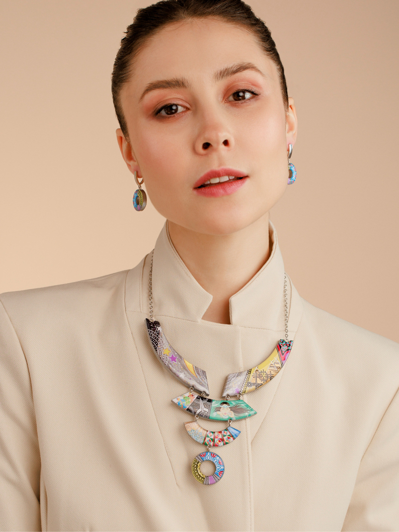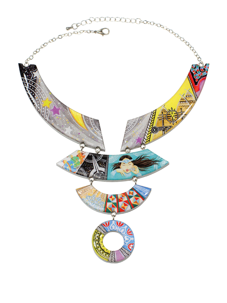 Бижутерия Raisa Plettserr - это всегда результат вдохновения и кропотливой ручной работы. Относительно своих размеров колье легкое, хотя смотрятся очень массивно, секрет в том, что основа деревянная. Поверх рисунка заливаем ювелирной смолой, покрываем защитным лаком.