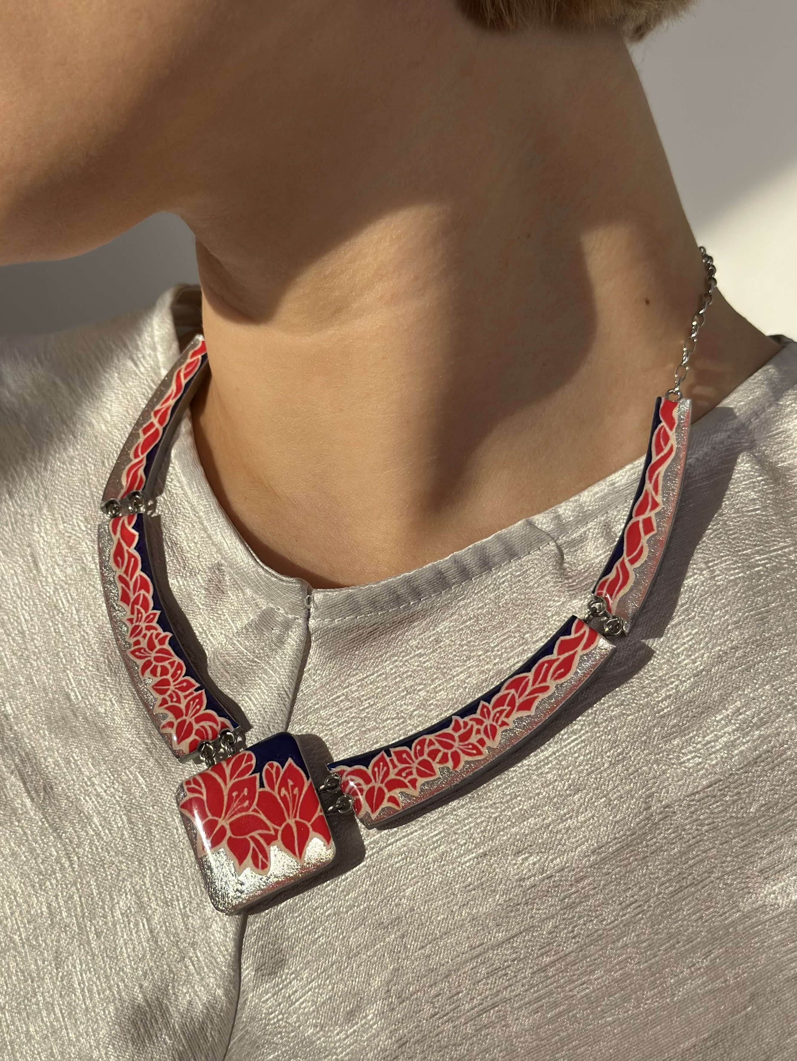 Бижутерия Raisa Plettserr - это всегда результат вдохновения и кропотливой ручной работы. Относительно своих размеров колье легкое, хотя смотрятся очень массивно, секрет в том, что основа деревянная. Поверх рисунка заливаем ювелирной смолой, покрываем защитным лаком. Фурнитура родированная, такая фурнитура не темнеет и на 100% гипоаллергенна.