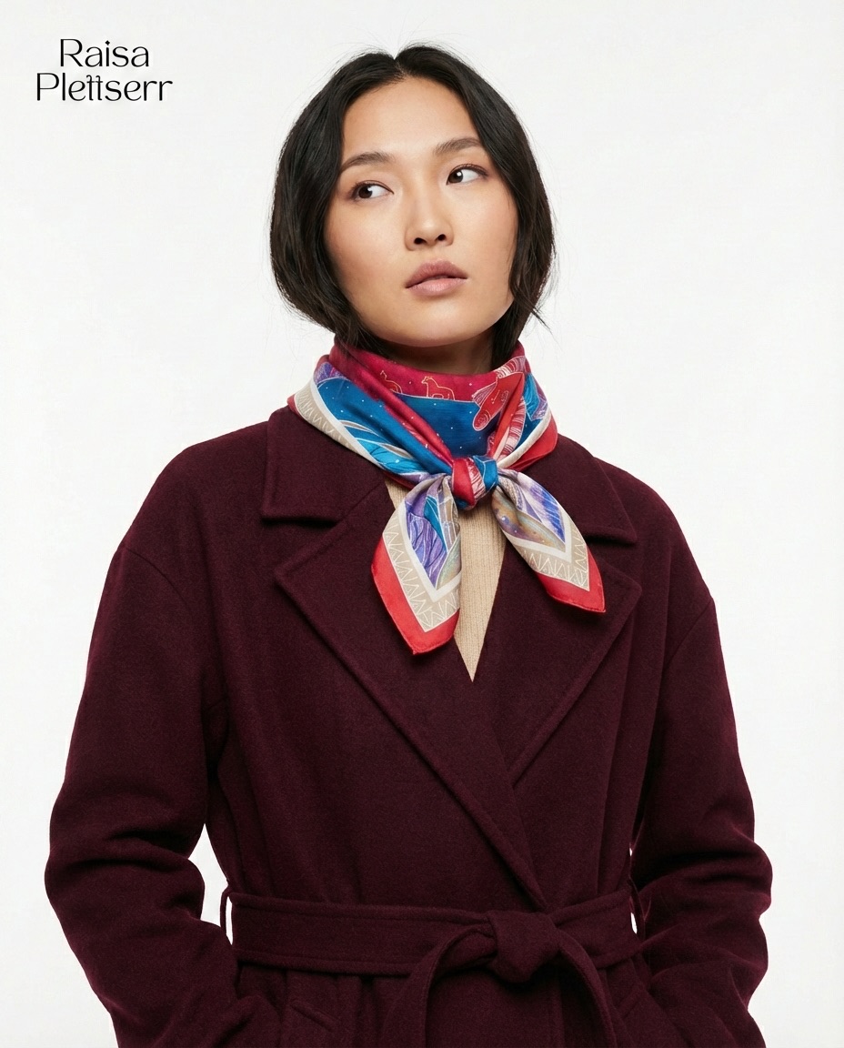 Классический квадратный формат позволяет носить платок как накидку, шарф, аксессуар на волосы, пальто или сумку.