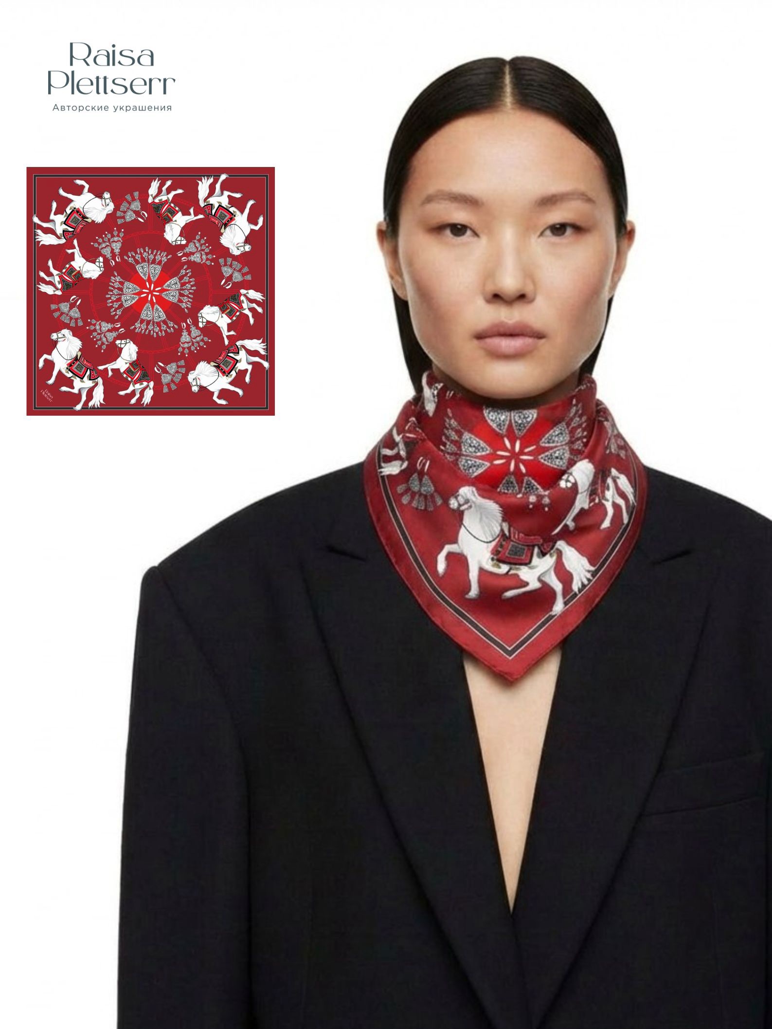 Классический квадратный формат позволяет носить платок как накидку, шарф, аксессуар на волосы, пальто или сумку.