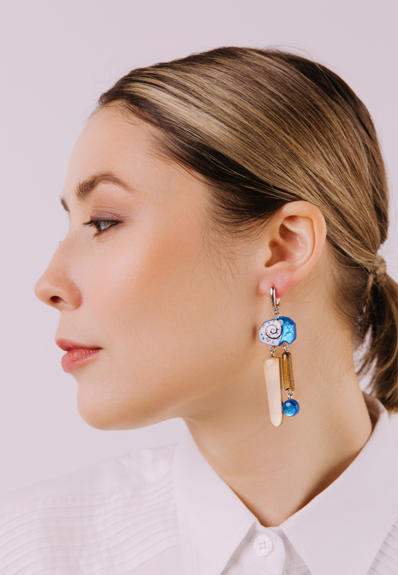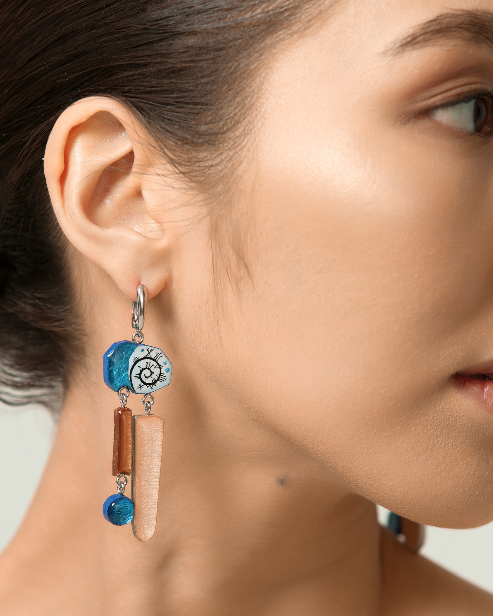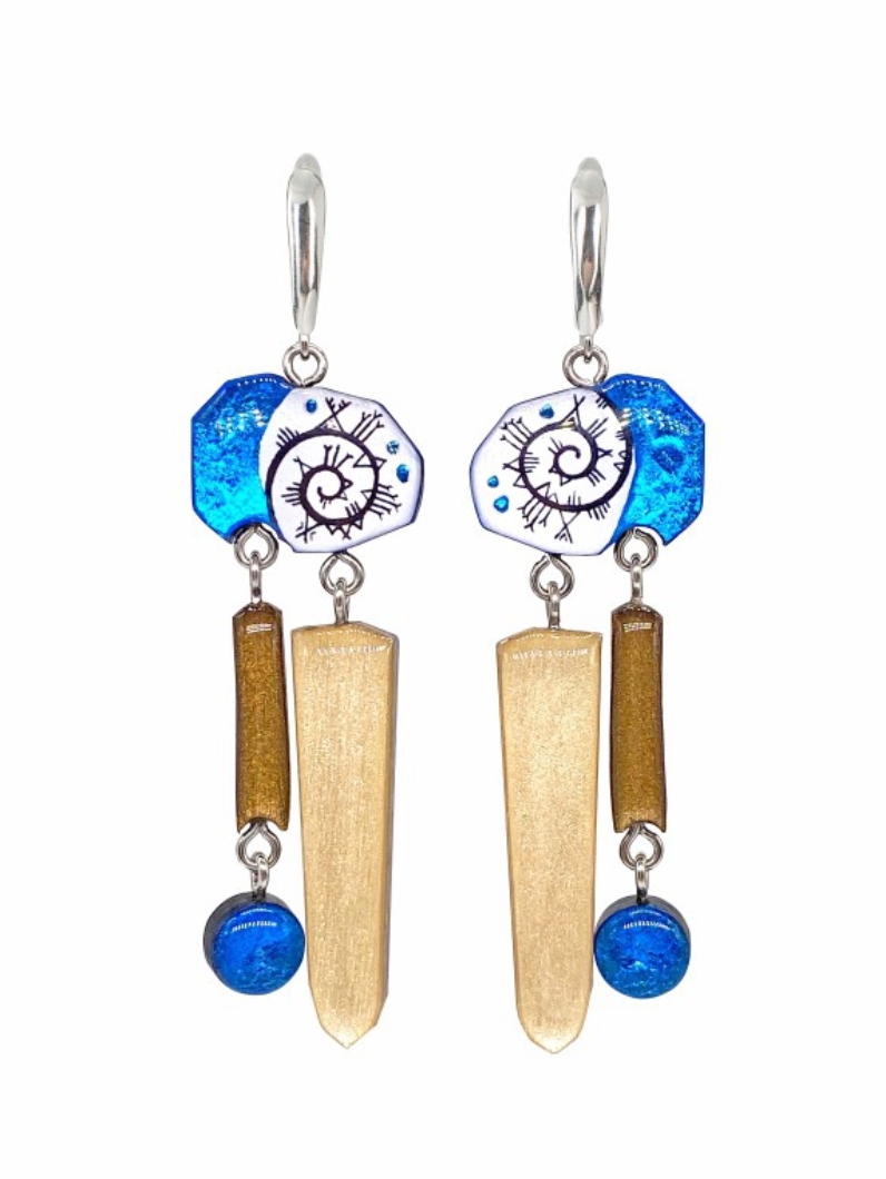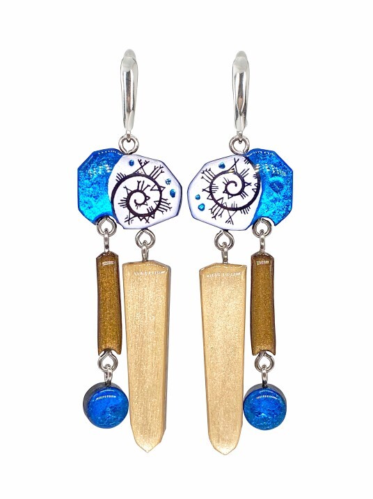 Бижутерия Raisa Plettserr - это всегда результат вдохновения и кропотливой ручной работы. Относительно своих размеров серьги легкие, хотя смотрятся очень массивно, секрет в том, что основа деревянная. Каждый кусок потали (фольги) вклеен вручную пинцетом. Поверх рисунка заливаем ювелирной смолой, покрываем защитным лаком. Фурнитура родированная, такая фурнитура не темнеет и на 100% гипоаллергенна.