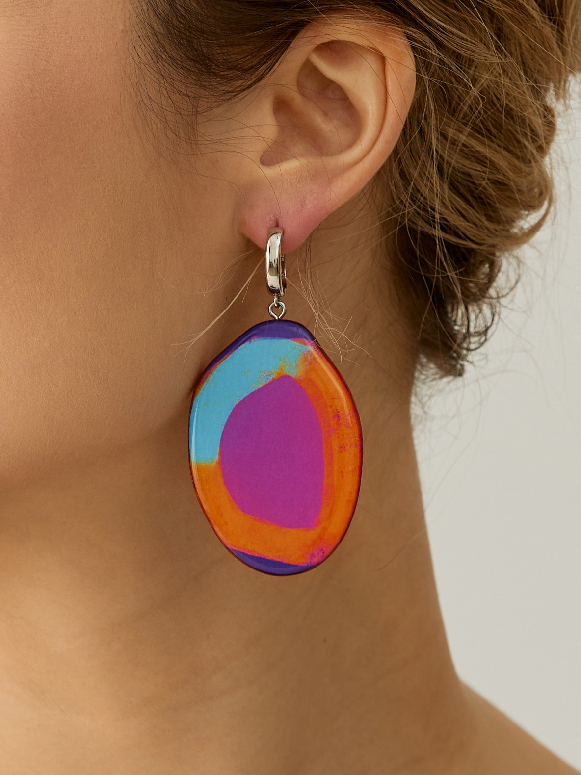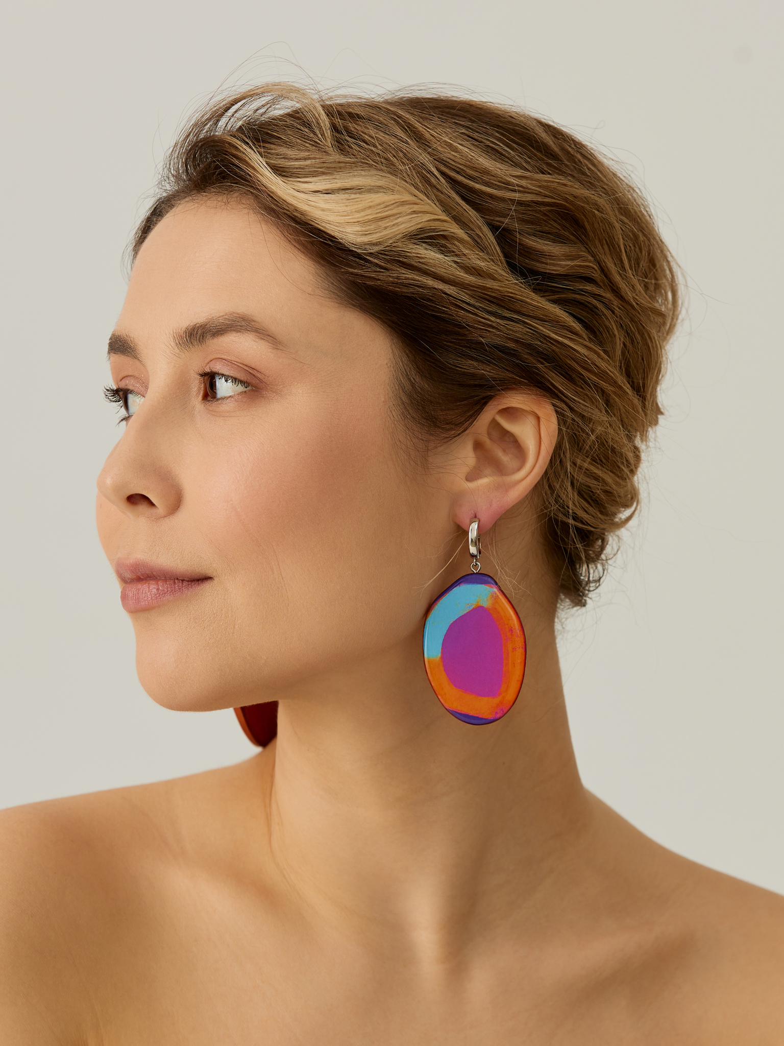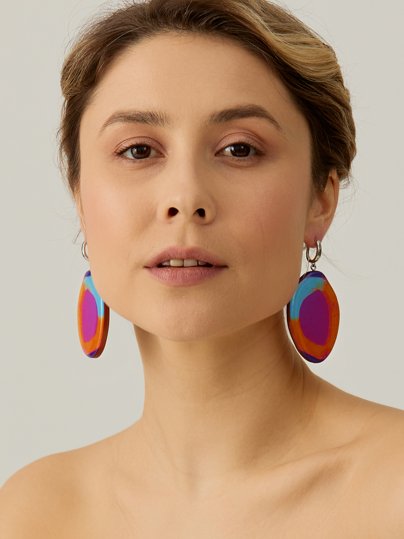Серьги с акварельными пятнами оранжевого, фиолетового и голубого цветов являются ярким и необычным аксессуаром, который может символизировать разнообразие и креативность. Оранжевый цвет часто ассоциируется с радостью, энергией и теплотой; фиолетовый - с роскошью и духовностью; голубой - с спокойствием, гармонией и доверием.