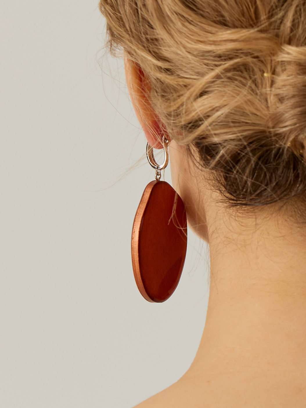 Бижутерия Raisa Plettserr - это всегда результат вдохновения и кропотливой ручной работы. Серьги деревянные, поэтому легкие несмотря на свои размеры. Поверх рисунка и задняя поверхность залиты ювелирной смолой. Задние и боковые поверхности медного цвета. Фурнитура родированная, такая фурнитура не темнеет и на 100% гипоаллергенна. Замок классический английский.
