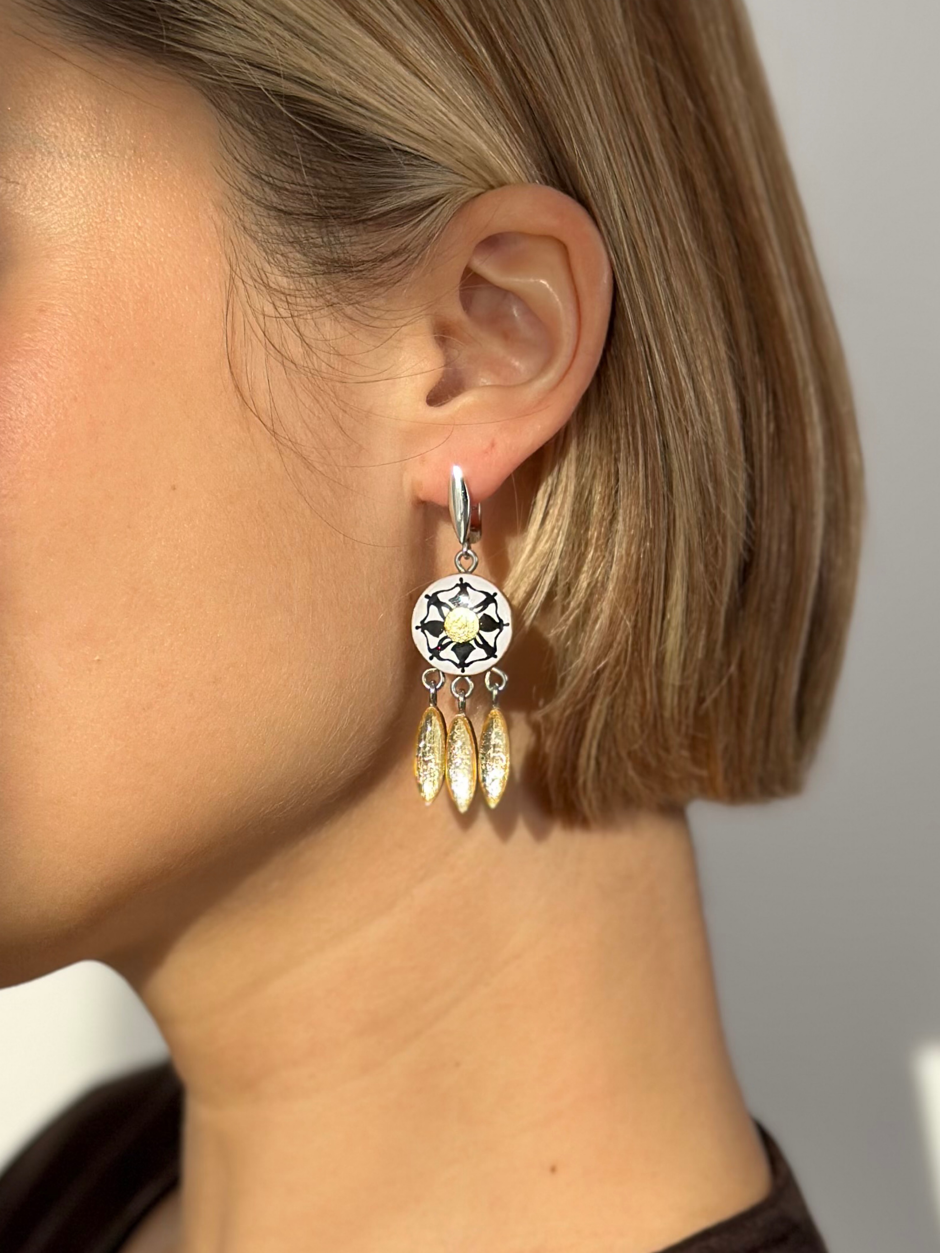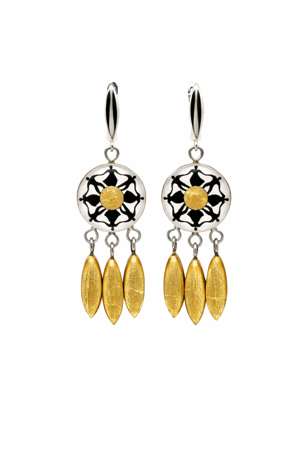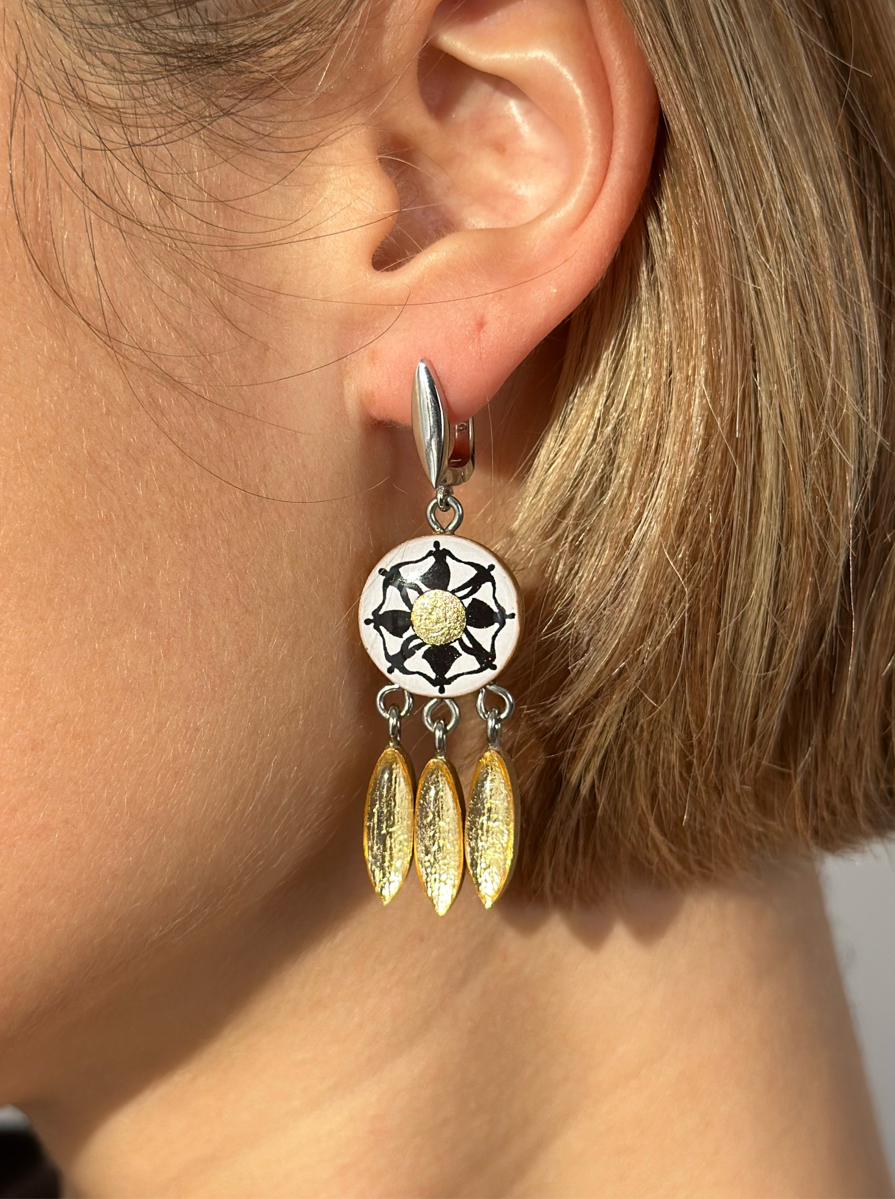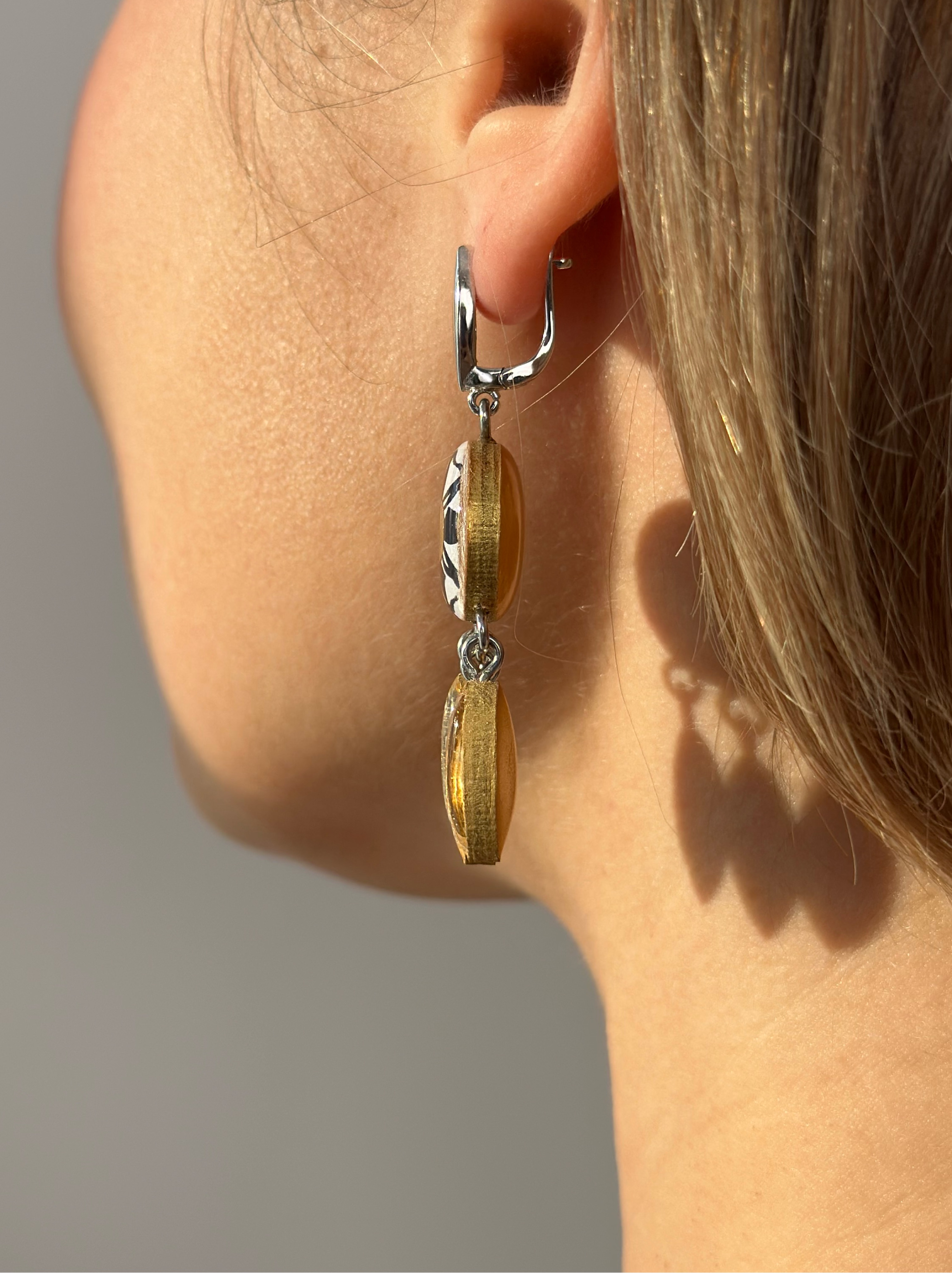 Серьги "Оhуохай" с золотистыми подвесками. Оhуохай - священный танец якутов, который является одним из основных компонентов национального праздника Ыhыах. Является символом дружбы и единства, связи человека с природой.